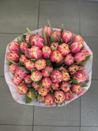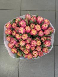 Dviguba rožinė-geltona tulpė su peonijai panašiu žiedu. Kaina už 1 tulpę.